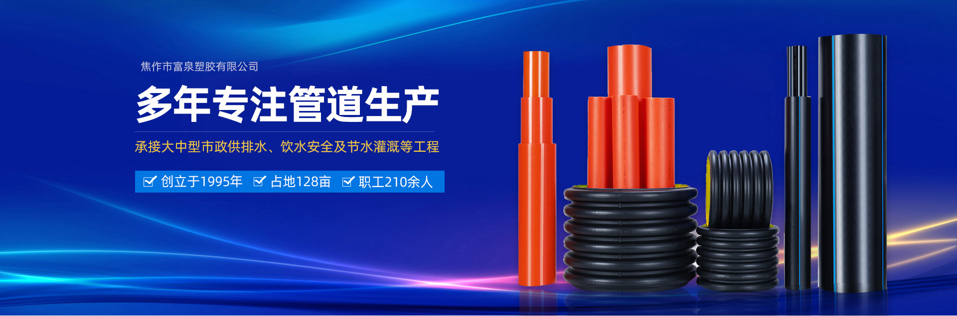 - 焦作市富泉塑胶有限公司,创立于1995年,是一家集研发、设计、生产、销售为一体的大型管材企业。公司位于太极故里、黄河之滨一一河南焦作温县。公司占地128亩,现有职工210余人,其中具有中技术职称的19人。生产、检验设备58台(套),包括PVC实壁管生产线11套、PE实壁管生产线12套、HDPE双壁波纹管生产线6套、PVC双壁波纹管生产线5套,检验设备14台(套)。主要产品有:Φ20mm-630mm、各种压力规格的PVCU、PVC-M、PE给水管材,PVC-U节水灌溉管材,HDPE燃气和矿用管材,DN200-800mm的HDPE、PVC双壁波纹管及各种喷灌、滴灌工程材料。承接大中型市政供排水、饮水安全及节水灌溉等工程?! 「蝗芙汗局厥硬返闹柿俊踩⒒繁:徒谀?,在同行业中率先完成了“新华节水产品认证”,全方面通过ISO9001:2008国际质量管理体系、IS014001:2004环境管理体系和OHSAS18001职业健康安全管理体系的一体化导入,并建立起规范的现代企业管理体系。公司以“质量”为先导,采用质量跟踪、多环节把关的方法,组建具有行业水准的企业技术检测中心,常年委托水利部节水灌溉设备检测中心、河南省产品质量监督检验院对产品跟踪检测,并由中国人民保险公司承保产品质量。公司连续多年被河南省水利厅确定为“安全饮水设备、节水灌溉设备”定点生产企业,并获得“中国名优产品”“质量、服务、信誉AAA企业”“河南省**产品”“河南省水利企业”“河南省守合同、重信用企业”等荣誉称号?! 「蝗芙汗炯岢帧坝没稀钡姆窭砟?,长期以来,全方面关注客户价值,不断提升服务水平。服务队伍常年为客户的产品设计、施工、安装提供合理的方案和全程细致、周到、**、快捷的技术服务。公司自成立以来,一直坚持以人为本的宗旨,塑造企业形象,并致力于新产品的开发,凭借雄厚的技术开发能力,先进的工艺制造流程,严格的质量管理保证体系,优良的售后服务网络,已成为河南省大的饮水、灌溉及排水管材设备制造商。产品畅销全国,而且还以公司雄厚的综合实力在业界中占据着重要的地位。